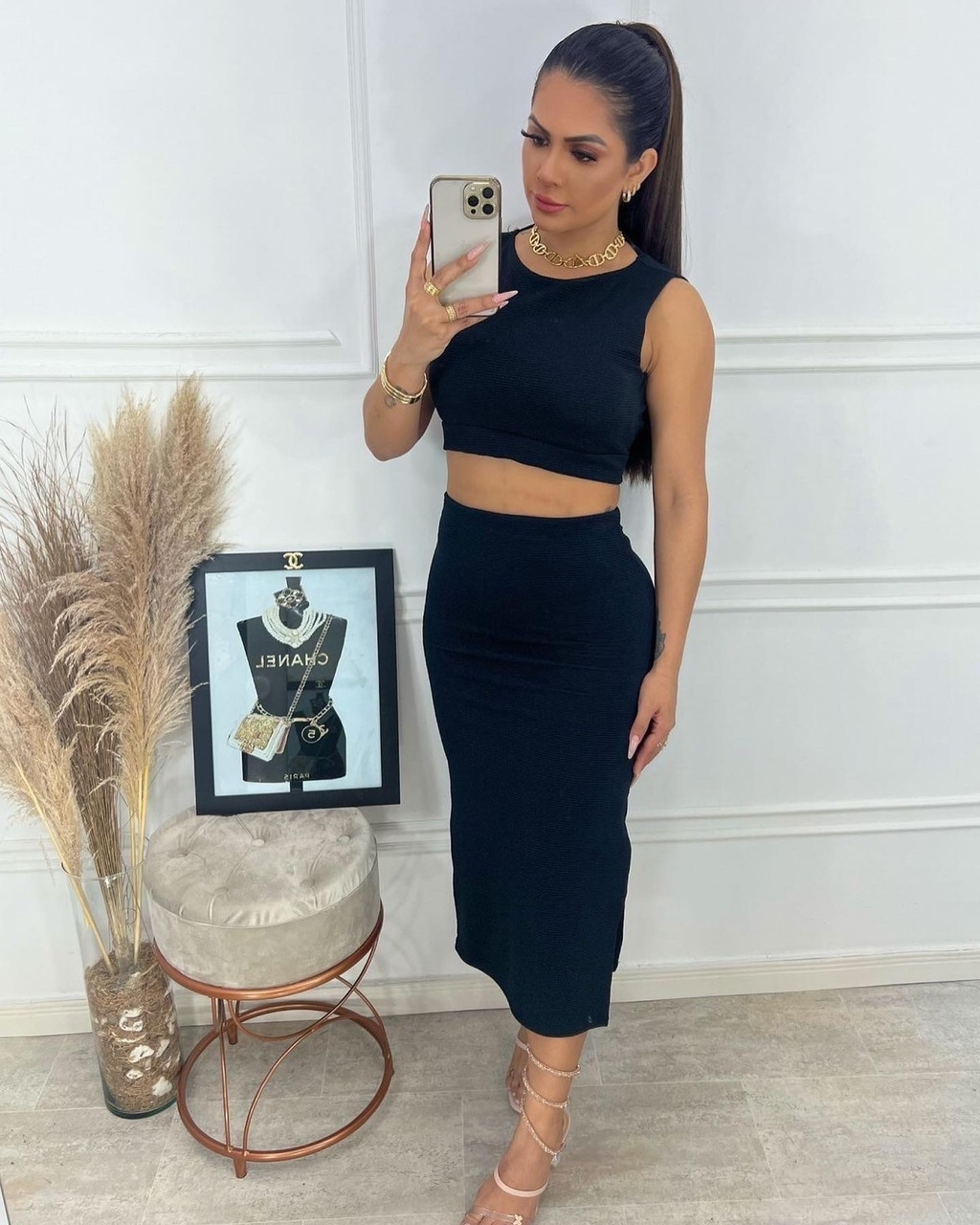Descubra o Conjunto Regata Mídi, uma escolha perfeita para quem busca praticidade e elegância em um só look. Este conjunto é composto por duas peças: uma regata cropped e uma saia mídi, ideal para diversas ocasiões.